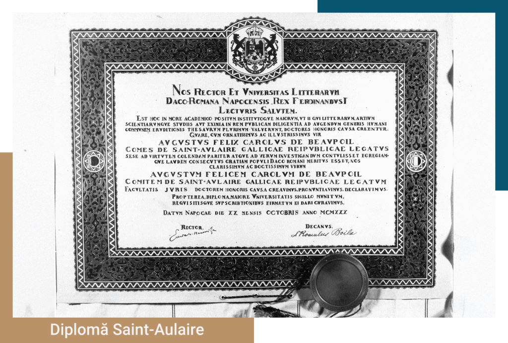 Tot în 1930, la propunerea Facultății de Drept, Universitatea acordă titlul de Doctor Honoris Causa lui Auguste-Félix-Charles de Beaupoil, conte de Saint-Aulaire. Venit ca ambasador în România în tumultoasa vară a anului 1916, atunci când România intra în Primul Război Mondial, contele ambasador a publicat ”Însemnările unui diplomat de altădată. În România, 1916–1920”, o analiză excelentă despre profundele transformări care aveau loc sub ochii lui.