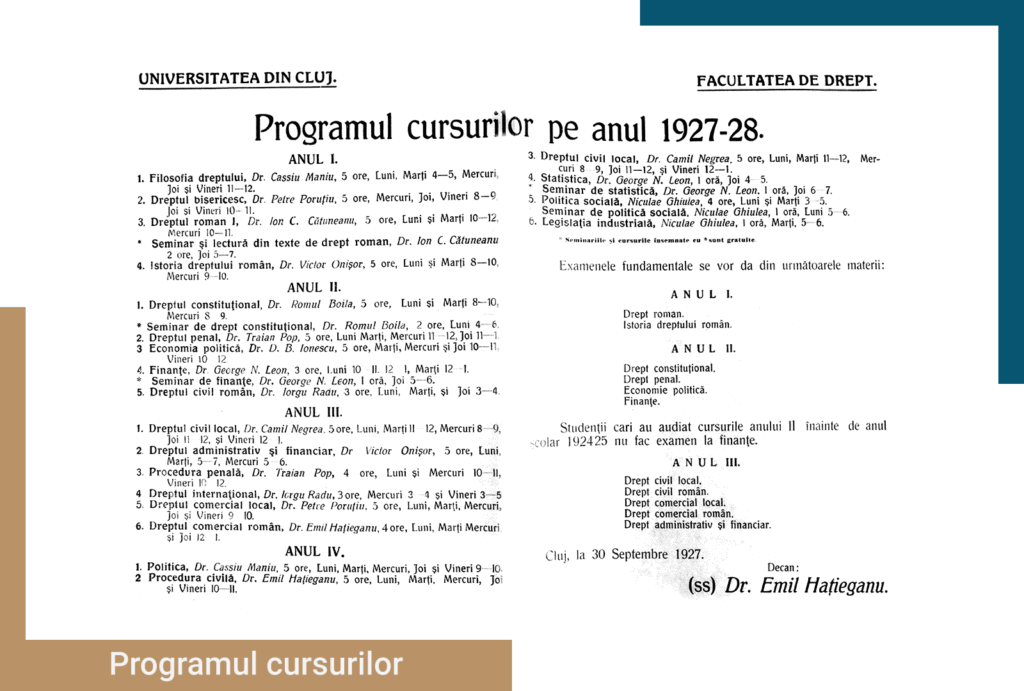 De exemplu, în anul universitar 1927 – 1928 programul cursurilor și profesorii Facultății de Drept, pentru cei patru ani de studii, erau următorii: