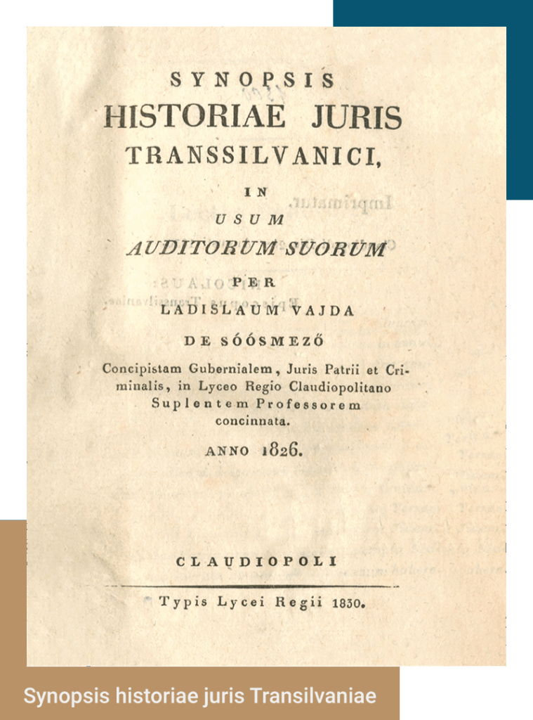 La sfârșitului secolului XVIII și începutul secolului XIX, Școala Ardeleană, prin Ioan Budai-Deleanu, manifestă interes pentru sistemul juridic, pe care îl prezintă în lucrări cum ar fi Rândueala judecătorească de obște (Viena, 1787); Carte de pravilă ce cuprinde legile asupra faptelor rele (Cernăuți, 1807); Codul penal (Lvov, 1807); Codul civil (Lvov, 1812). În anul 1826, un profesor de naționalitate română care a predat la Catedra de Științe Juridice a Liceului Piarist din Cluj între anii 1817 și 1824, Ladislau (Vasile) Vaida, publică Synopsis historiae juris Transilvaniae (Conspect de istorie a dreptului transilvan).